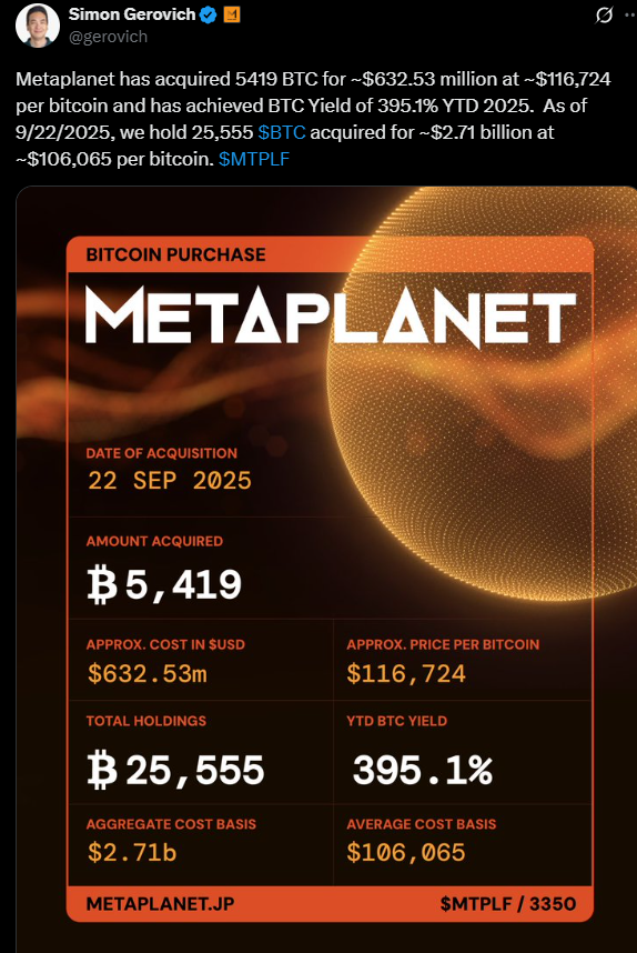 CEO Simon Gerovich announced the purchase on X, revealing they paid an average price of about $116,724 per Bitcoin. With this latest haul, Metaplanet’s total Bitcoin stash has reached 25,555 BTC, worth approximately $2.71 billion at their average purchase price of $106,065 per coin.